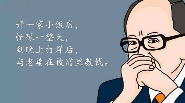 此前,在李嘉诚70岁大寿宴宾客上的时候,曾有宾客问他:你平生最大的愿望是什么呢?李嘉诚则附耳道:开一家小饭店,忙碌一整天,到了晚上打烊后,与老婆在被窝里数钱。我们不禁感叹,有钱人的世界真的是简单:不知妻美刘强东、一无所有王健林、悔创阿里巴巴马云……现在我们又知道了一位:“餐饮老板”李嘉诚。