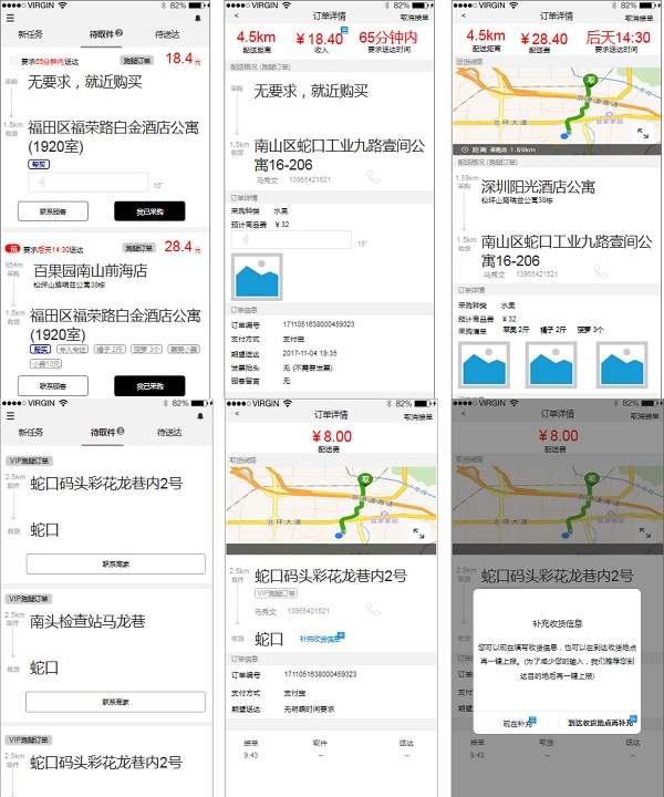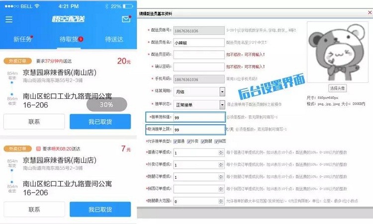 悟空快跑APP主页面分为新任务、待取件、代送达三个进度界面。后台可自由设置配送员的处理订单上限和取消订单数上限,防止配送员盲目抢单导致配送不及时。而且根据用户们下达不同类型的订单,悟空跑腿APP上都会有明显的类别显示(订单左上角或订单下方会有外卖订单、普通订单、跑腿订单(帮买、帮送)、调度台指派、调度台改派、预约订单标签)当用户下单后,负责所在区域的配送员刷新悟空跑腿APP即可在新任务界面接单(订单排列顺序按抢单通知下发时间倒序排列)。