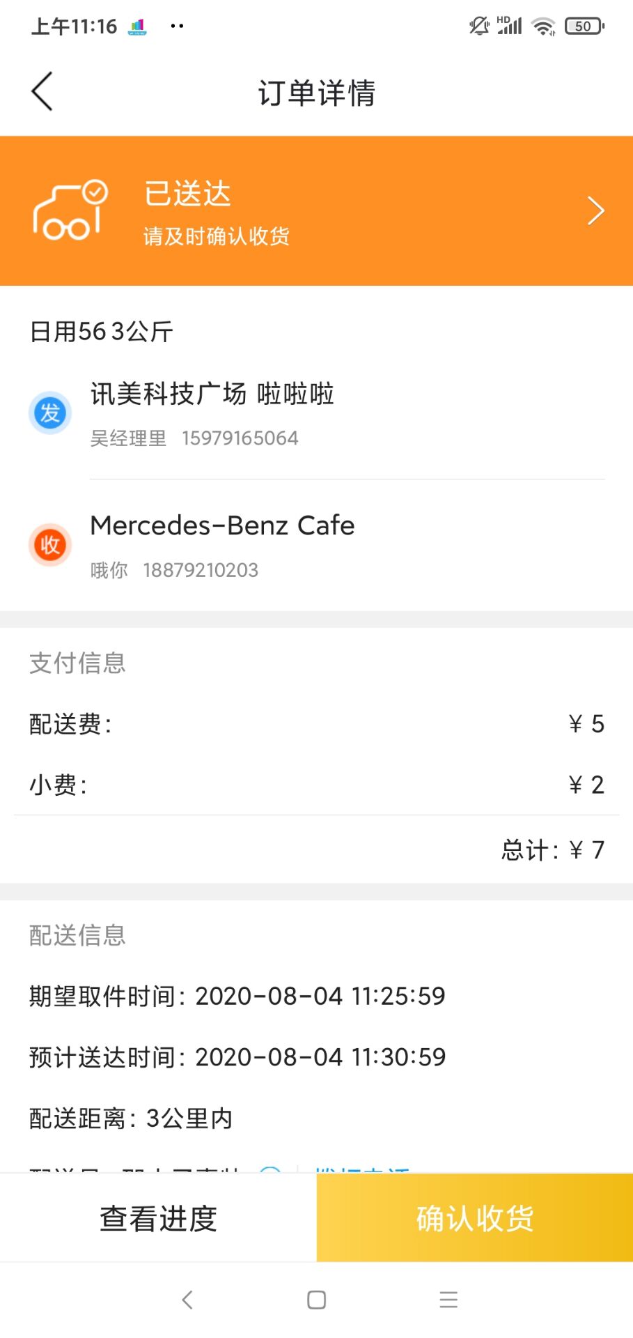 配送员可点击订单详情获取联系人的电话,送货距离,通过APP内的地图导航取件送件。